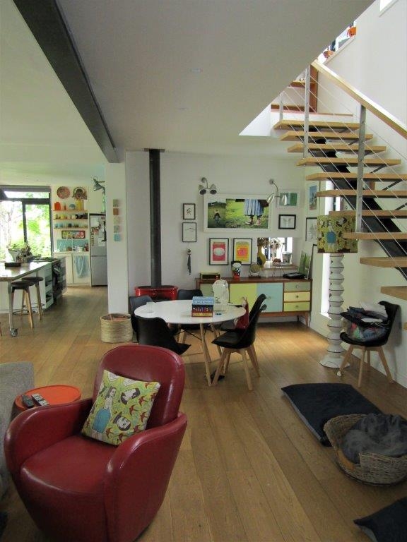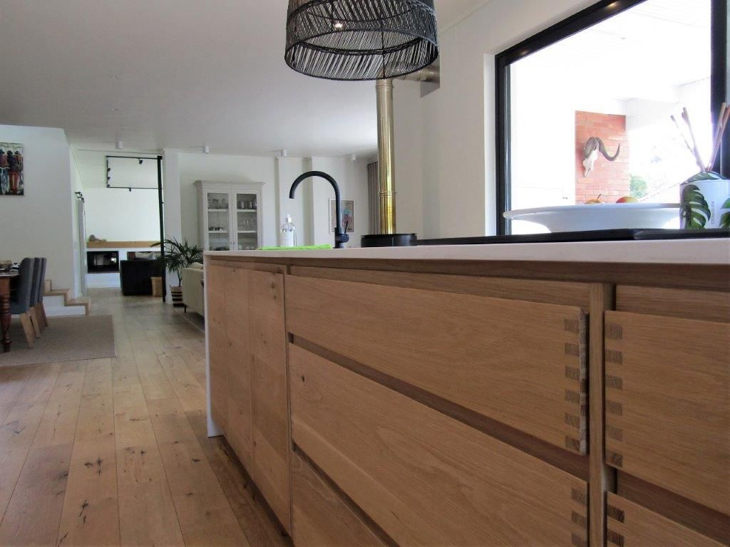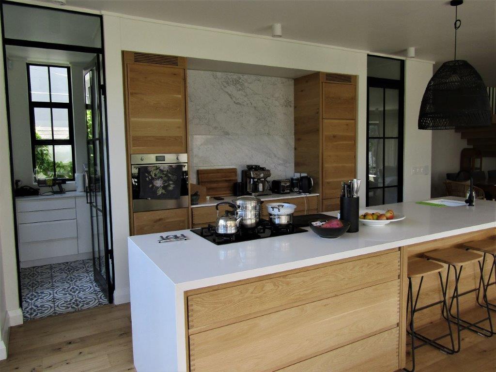 The original house underwent a significant transformation, including the addition of a second story cleverly integrated within the roof space. This expansion resulted in a contemporary open-plan residence. The aesthetic is further elevated by bespoke, handcrafted oak joinery, black steel internal windows, elegant oak stairs, and expansive sliding doors that invite the outside in. To enhance sustainability and resilience, the property also features water tanks, variable speed drive (VSD) pumps, and a photovoltaic (PV) system with battery backup. Ultimately, the redesigned house achieves a harmonious integration with the surrounding landscape.